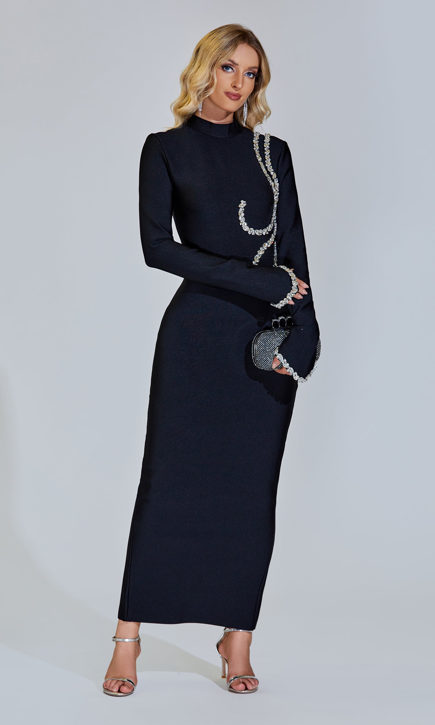 Elevate your evening ensemble with our Emerald Black Long Sleeve Maxi Dress. This exquisite piece boasts a rich black hue that exudes elegance and sophistication. The long sleeves add a touch of refinement, while the flowing maxi length creates a sleek and graceful silhouette, perfect for formal events or special occasions. Crafted with meticulous attention to detail and a figure-flattering design, the Emerald dress is a versatile and timeless addition to your wardrobe. Make a statement with this captivating black long sleeve maxi dress, showcasing your style and grace with every step you take.