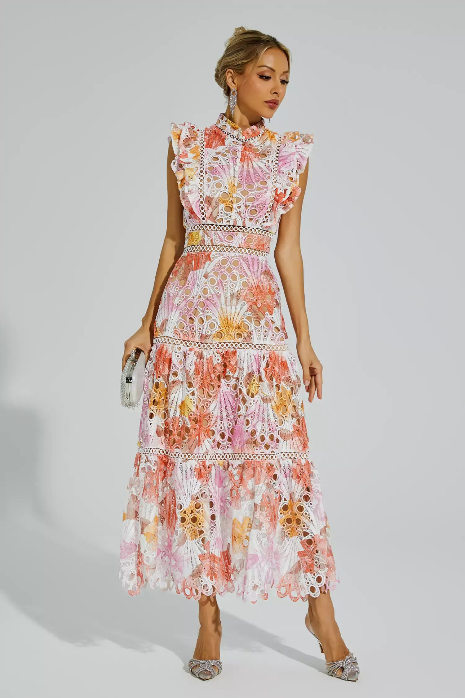 The Ayleen Orange Hollow Sleeveless Maxi Dress is a stunning addition to any wardrobe. Its intricate embroidery and lace detail exude elegance and charm. With a high collar and sleeveless design, it offers a perfect balance of sophistication and versatility. This dress is a must-have for any fashion-forward woman.
