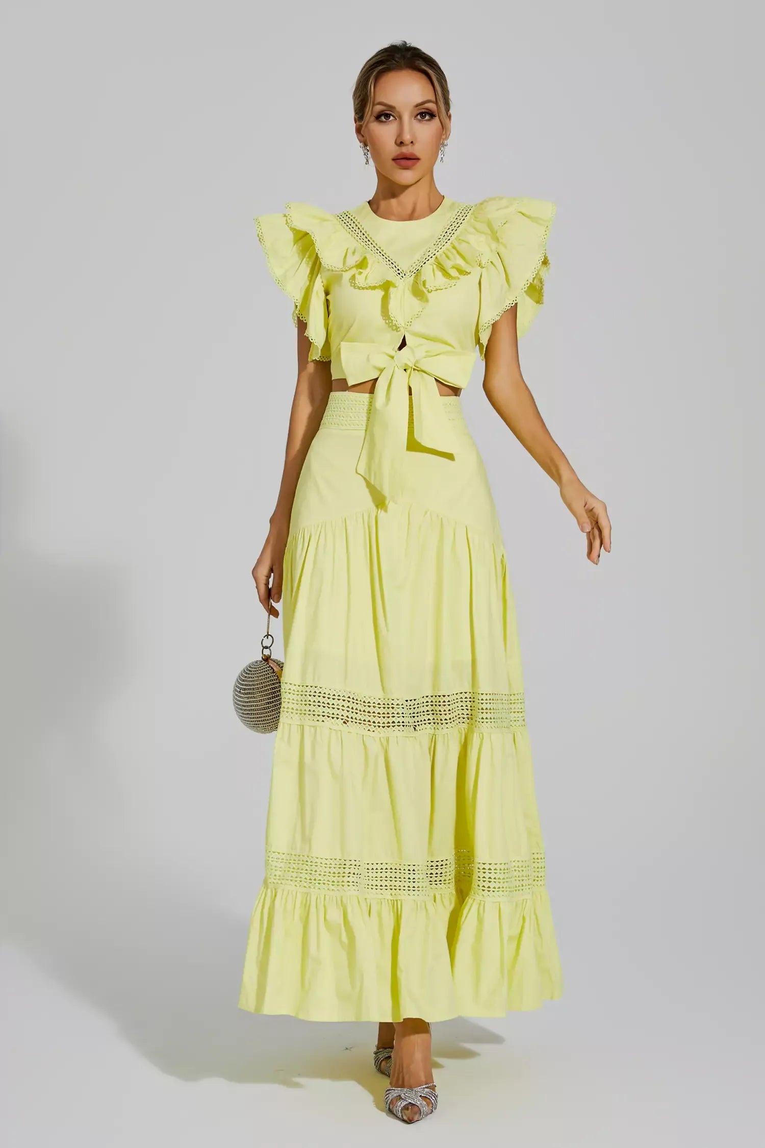 The Zoie Yellow Ruffled Sleeveless Set is a fashionable ensemble that exudes elegance and style. This set comprises a short-sleeved top with fluttery ruffles and a high-waisted midi skirt. With its trendy design and vibrant yellow hue, it is the perfect outfit for any occasion.