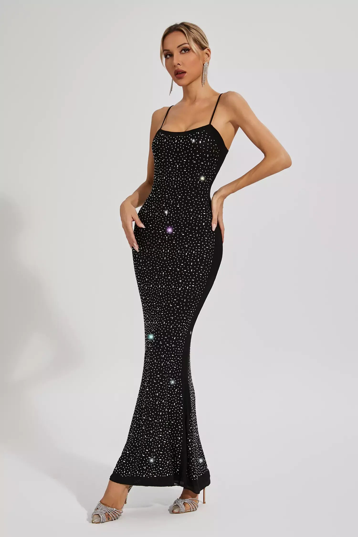 Experience timeless beauty with our Indie Black Embellished Mesh Maxi Dress. Showcases a delicate mesh overlay adorned with exquisite embellishments. Its graceful silhouette effortlessly flatters your figure. Perfect for special occasions or a night out.