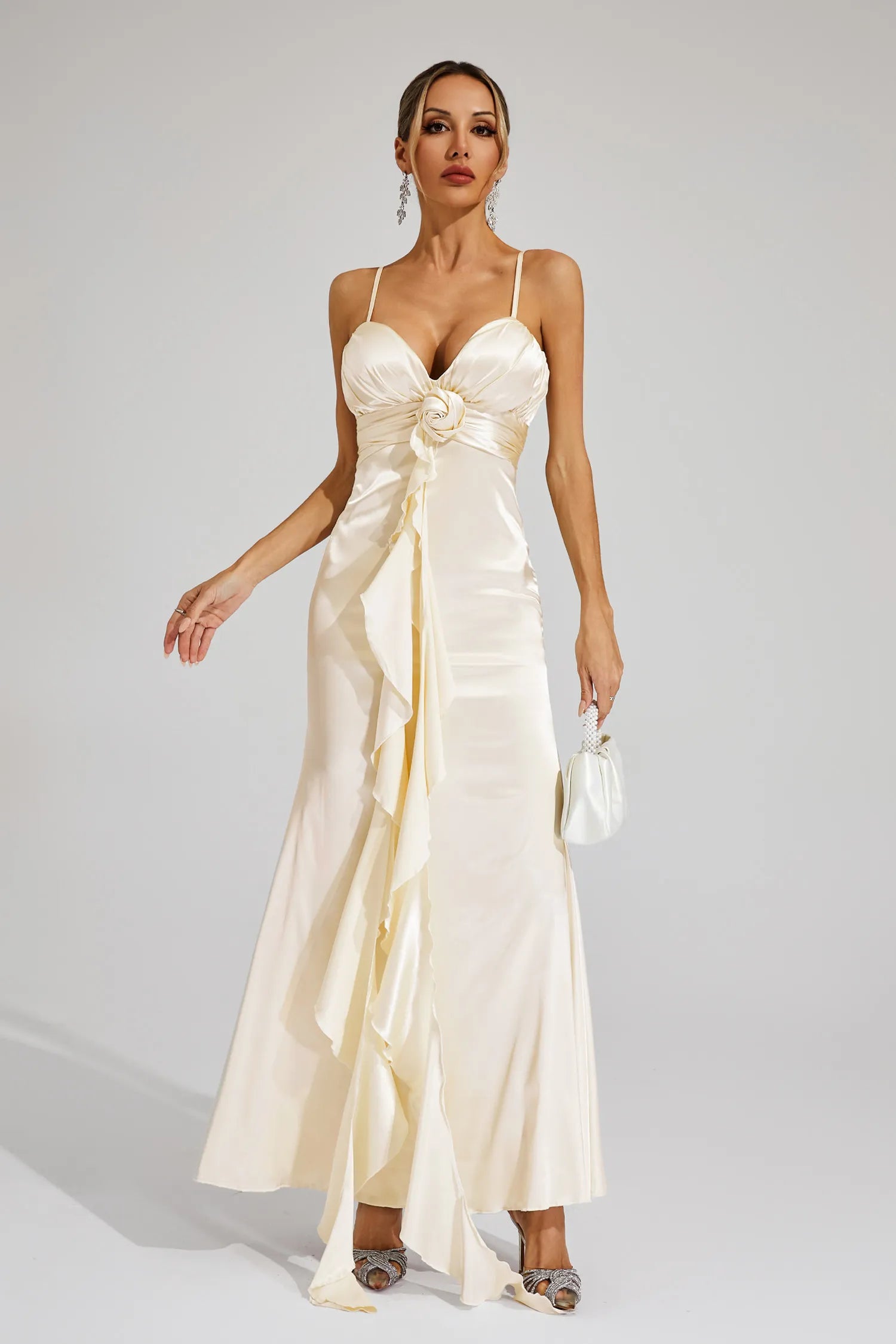 Indulge in luxury with our Joana Satin Rose Maxi Dress. This elegant piece exudes sophistication with its V-neck, slinky straps, and flowing silhouette, perfect for romantic evenings, island getaways, or beach vacations. Elevate your style effortlessly.