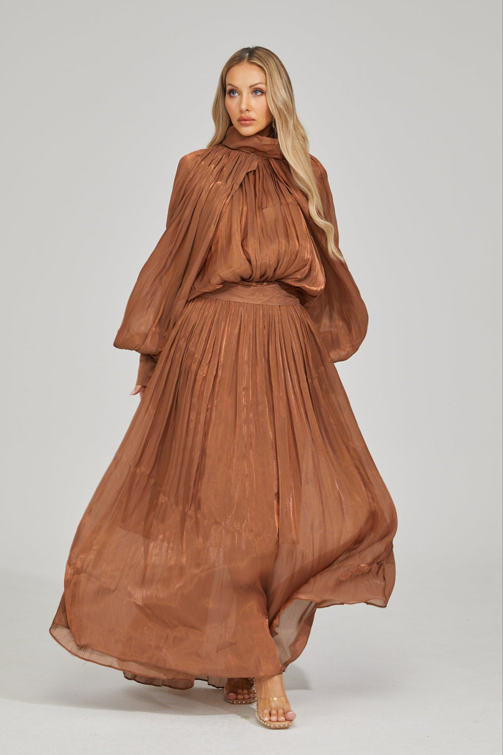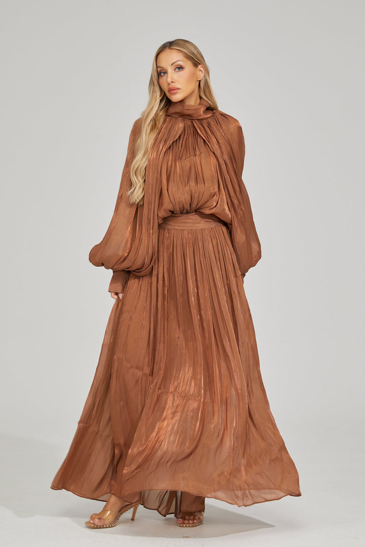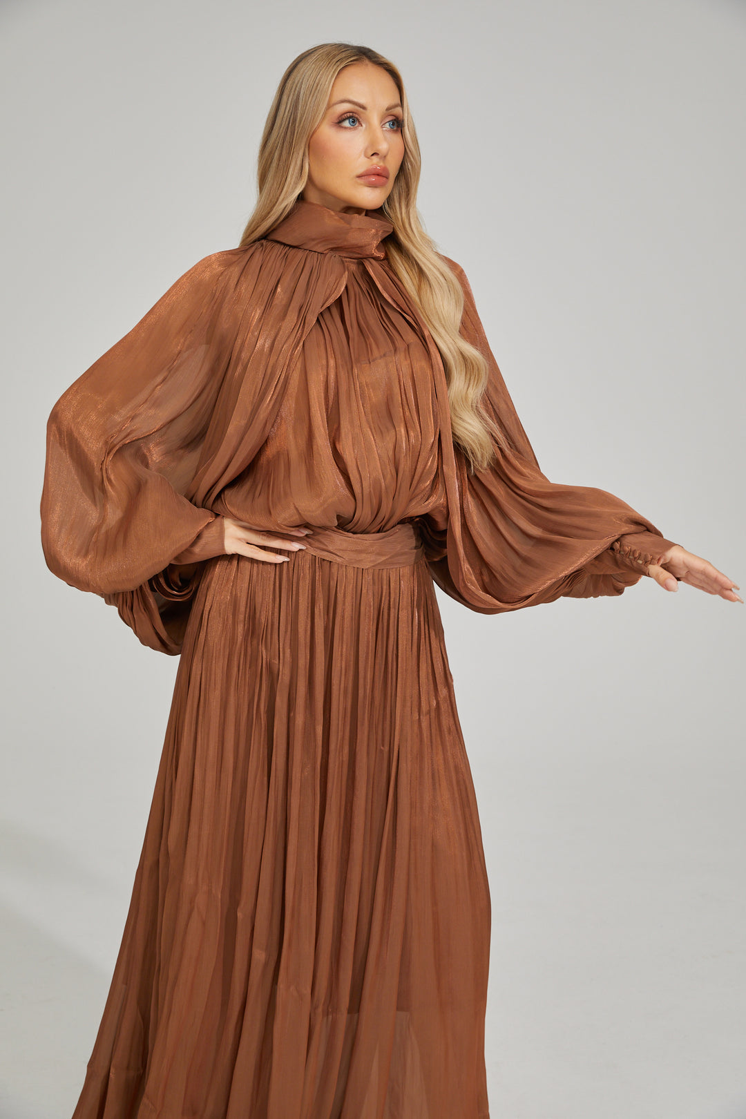 Step into luxurious elegance with the Julissa Golden Hour Flow Maxi Dress. Crafted from silky, pleated fabric in a warm, earthy brown tone, this dress features a high neck with delicate pleating that flows into a relaxed silhouette. The long sleeves with elastic cuffs add a soft, romantic touch, while the flowing skirt gently moves with each step, creating an ethereal, graceful look. Perfect for an evening event or a special gathering, this dress exudes understated sophistication and timeless beauty, making you feel both confident and captivating.