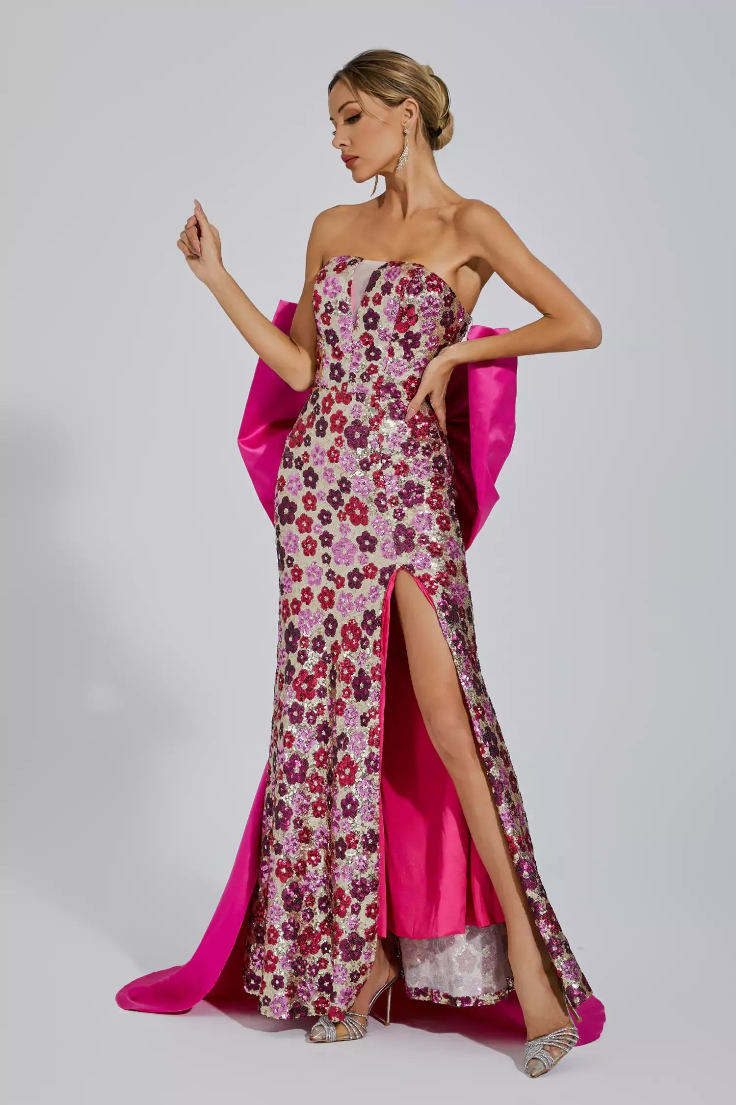 Elevate your elegance with the Kiera Pink Flower Sequin Maxi Dress. This exquisite evening gown combines sophistication with a touch of glamour. Featuring a strapless, sweetheart neckline and a beautiful train, it is perfect for weddings, engagements, and formal events. The intricate flower sequin detailing adds a luxurious flair to your ensemble. Step into the spotlight and make a statement with this stunning dress.