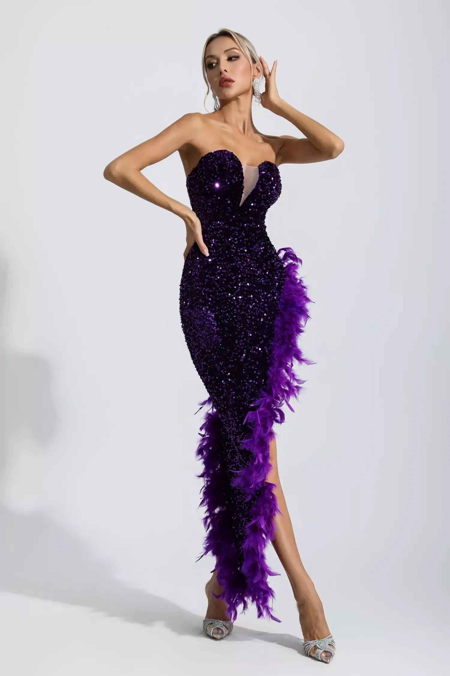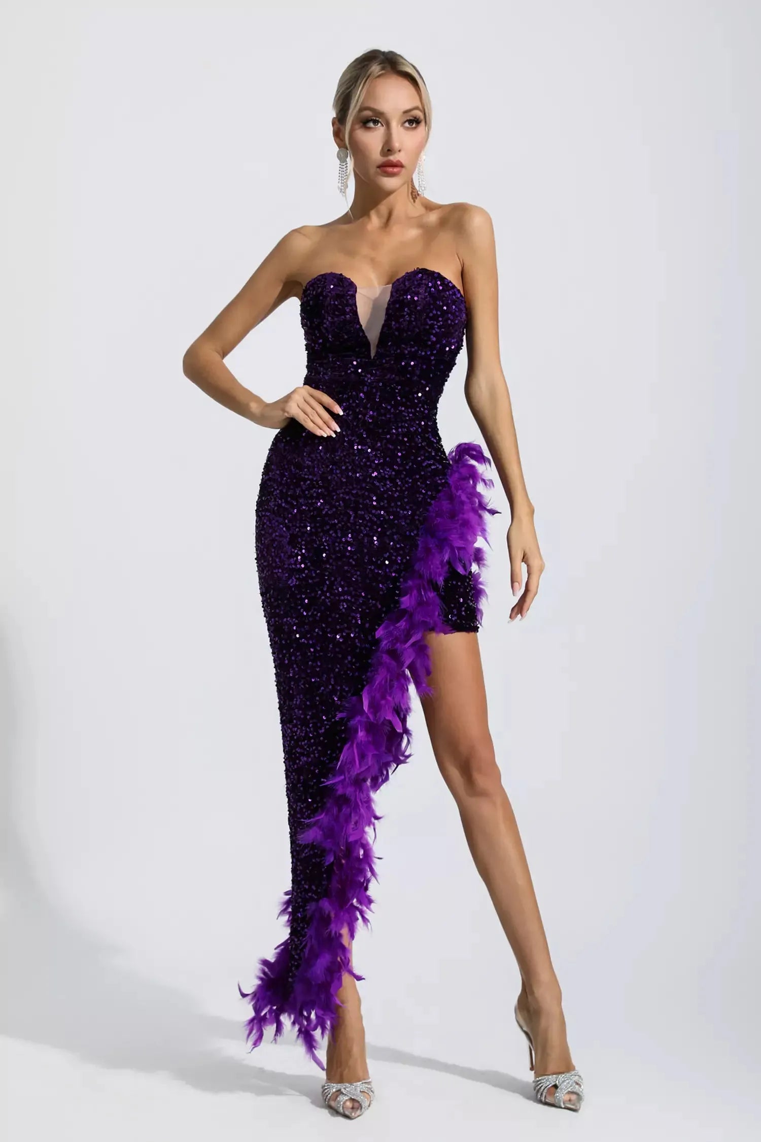 Spending the night in the Kira Champagne Sequin Feather Dress is something you'll be dreaming about for days to come! This sophisticated dress features a strapless design with a V-neckline for sensual appeal. Glittering sequins shine beautifully and add a touch of glamor and luxury to the overall design. Feathers give you charming details. Just add a pair of heels to complete the look!