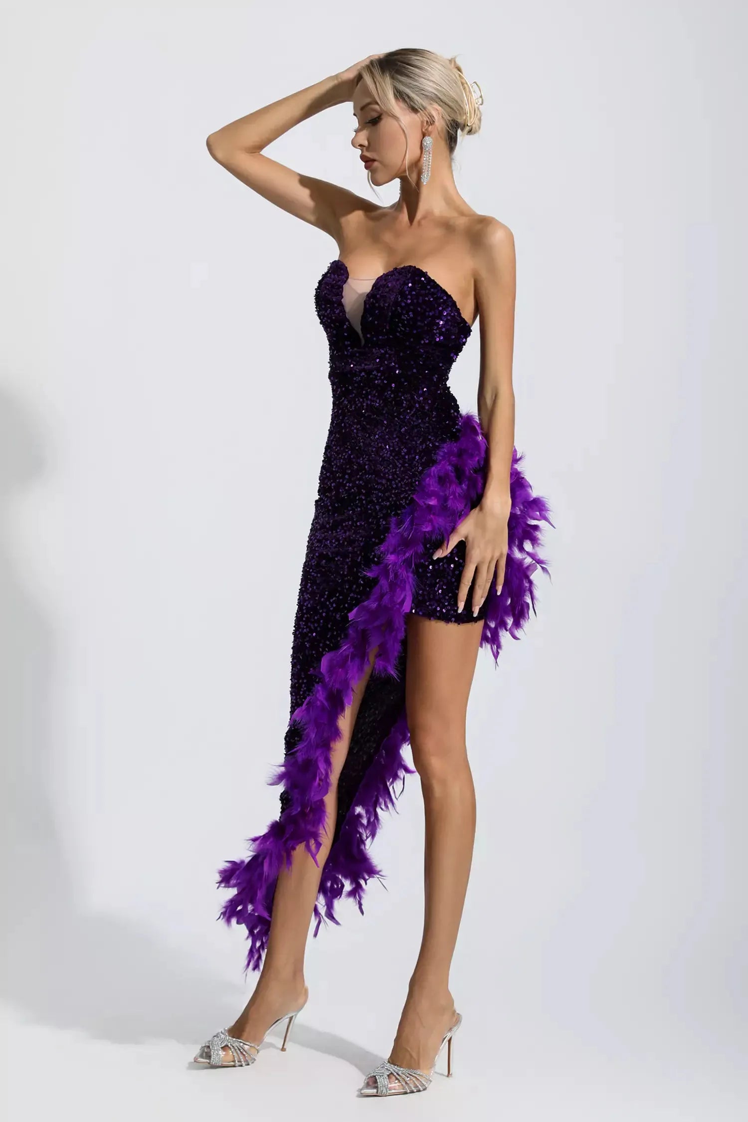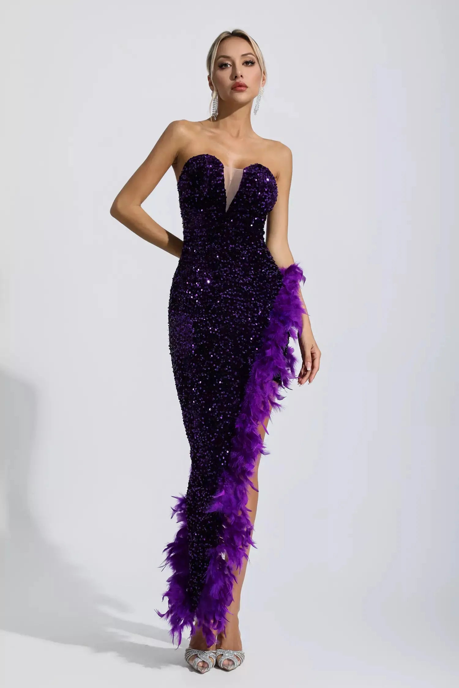 Spending the night in the Kira Purple Sequin Feather Maxi Dress is something you'll be dreaming about for days to come! This sophisticated dress features a strapless design with a V-neckline for sensual appeal. Glittering sequins shine beautifully and add a touch of glamor and luxury to the overall design. Feathers give you charming details. Just add a pair of heels to complete the look!