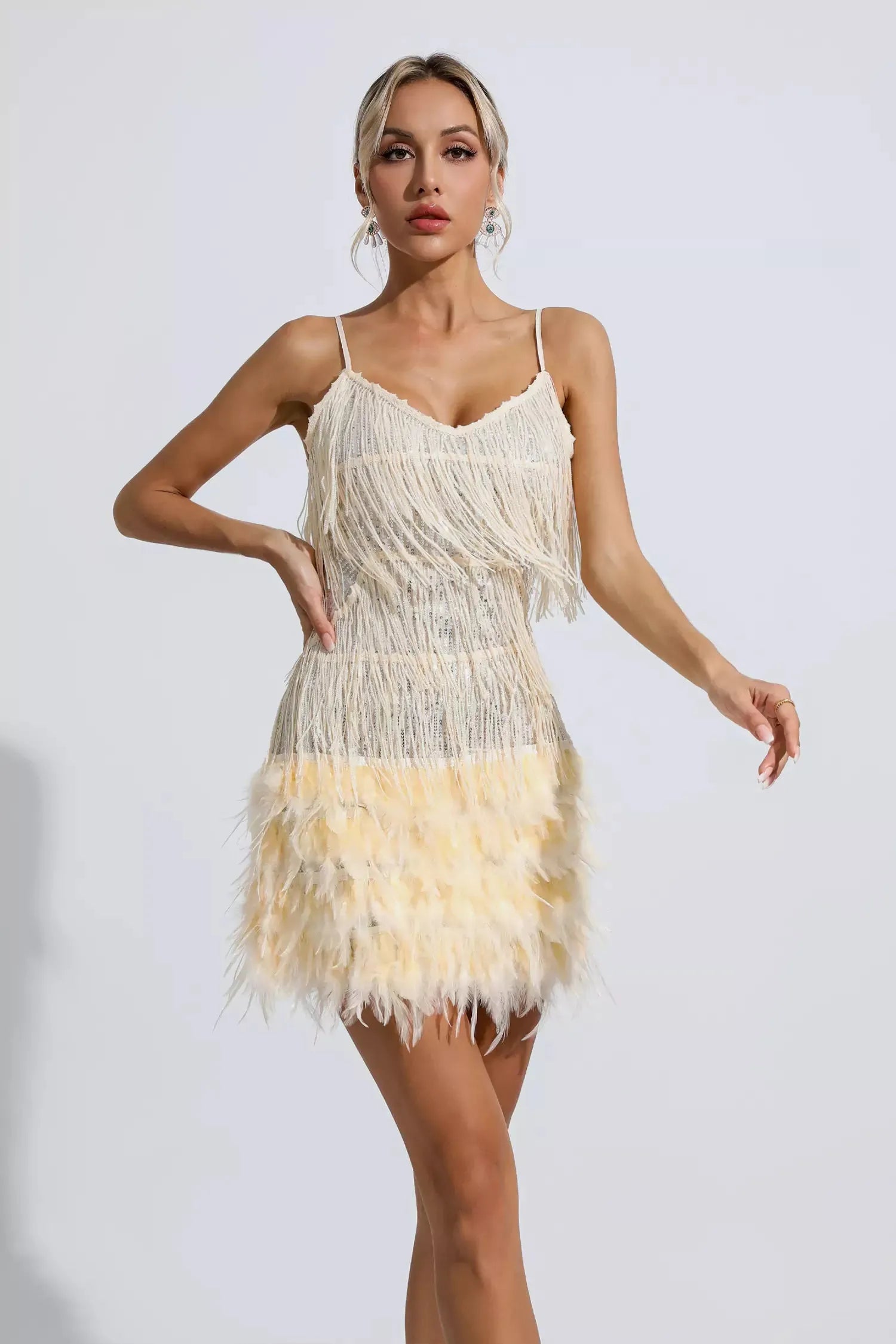Have a night of fun in the Lilliana Champagne Feather Tassel Sequin Mini Dress! Gorgeous off-the-shoulder dress featured in a slim mini cut. Made of delicate pink fringed sequin fabric, it is trimmed with a ring of feathers at the hem. Between movement and stillness, it shines with charming light. Team it with stilettos and your favorite mini bag for an unforgettable look.