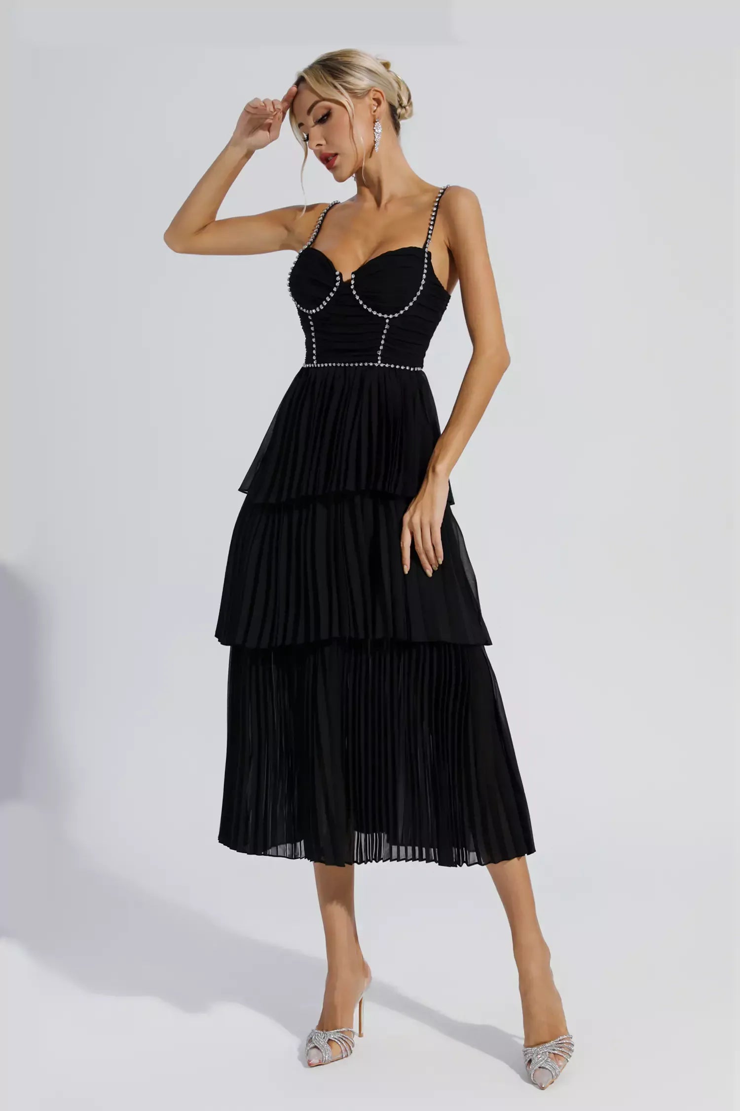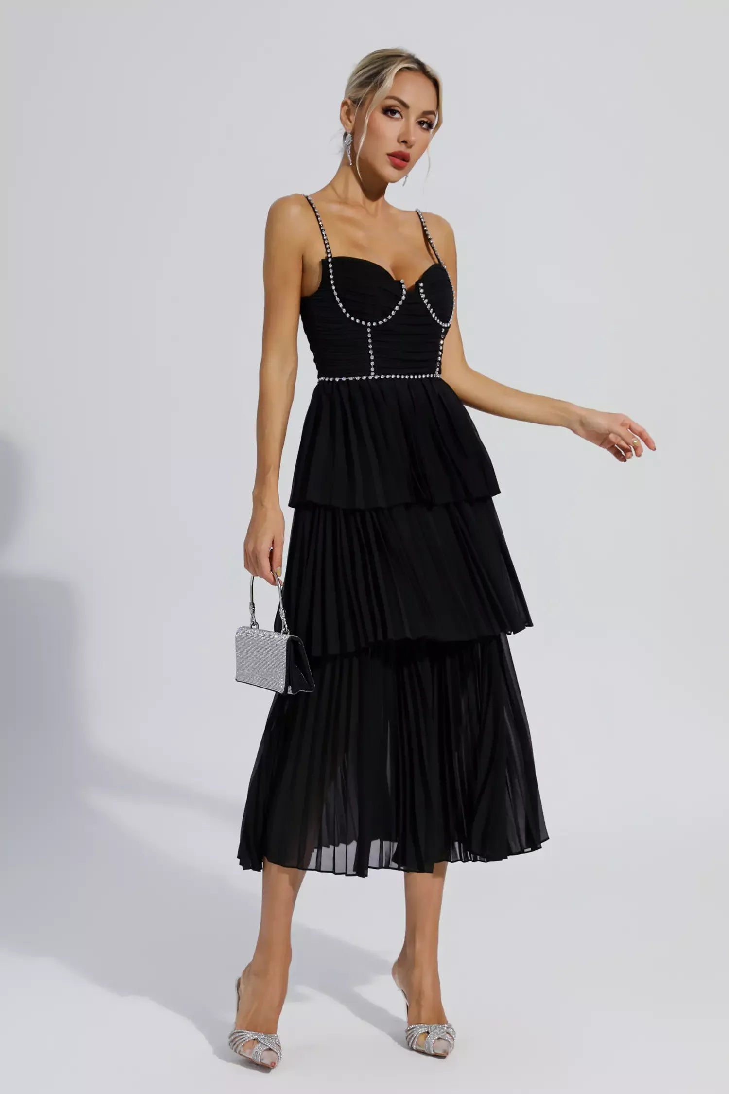 The Meredith Black Diamond Ruched Maxi Dress is sure to wow the crowd at your next special event! Cut from high-quality pleated fabric, diamond-embellished suspenders, meticulous tailoring, bringing charming details. The high-waisted design and loose skirt easily flatter your figure. Pair it with high heels for a party-ready look.
