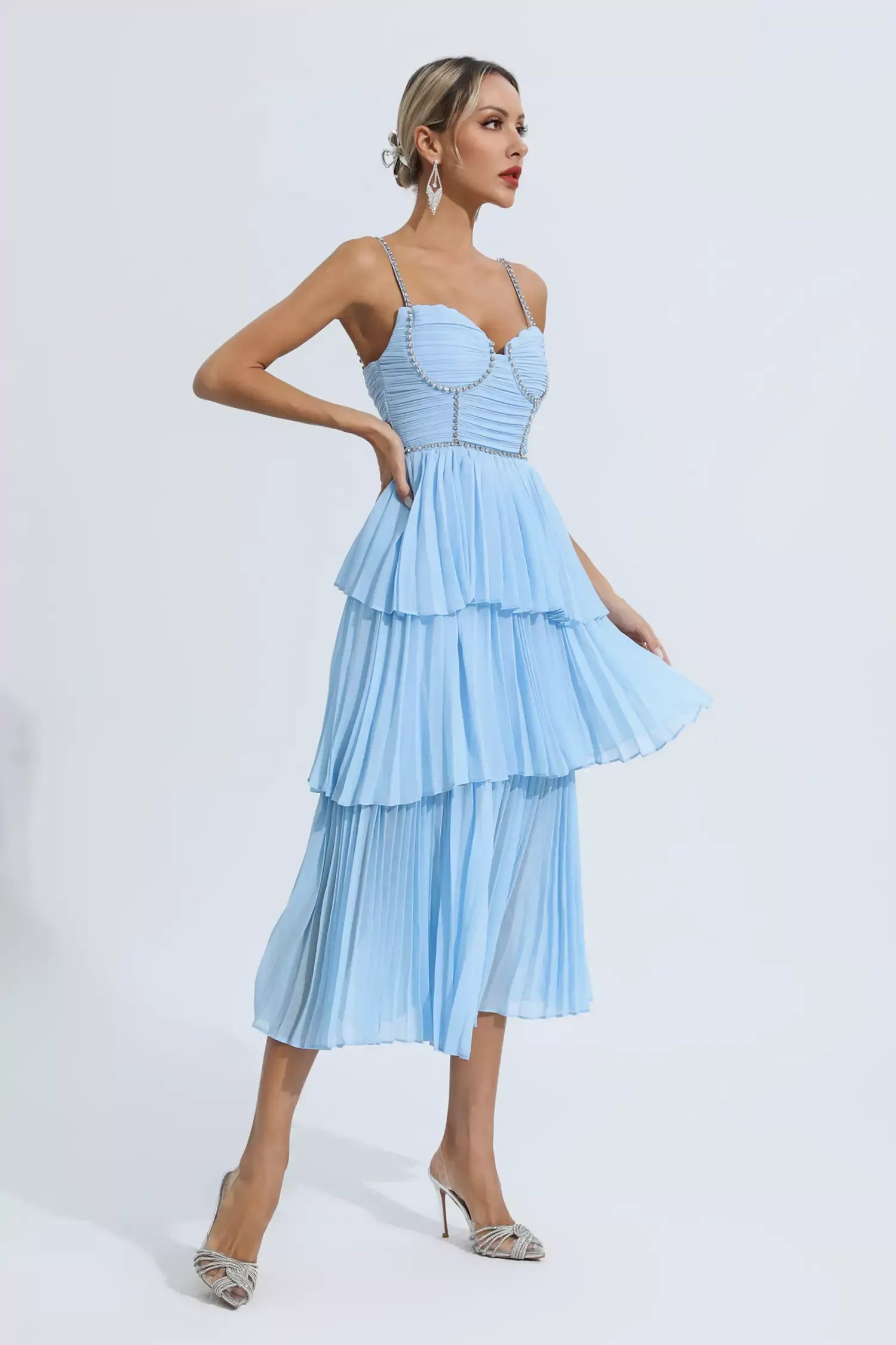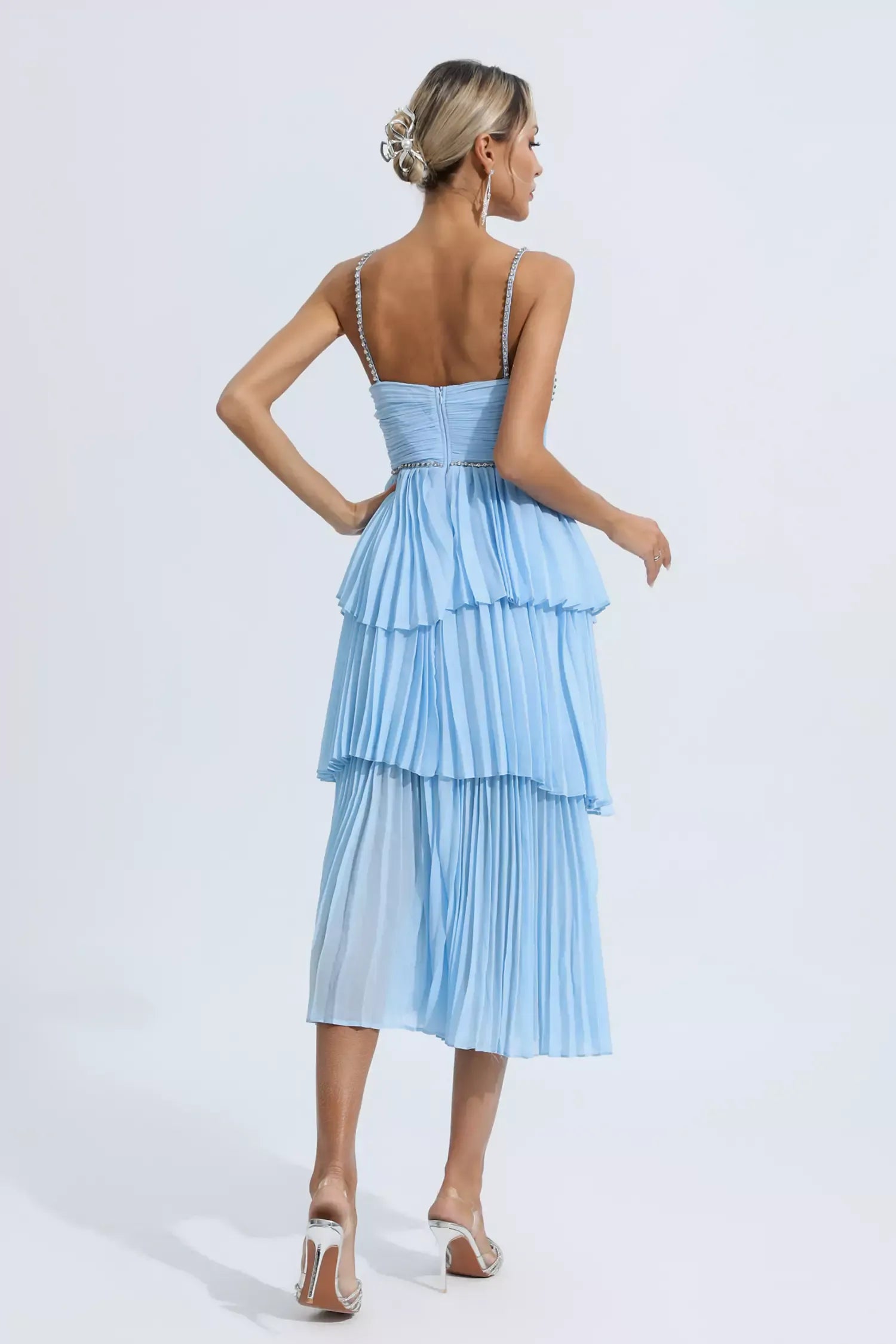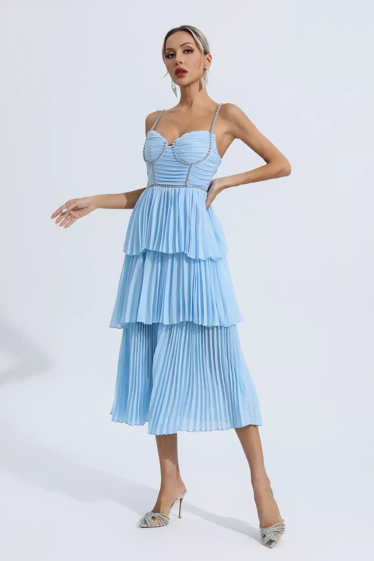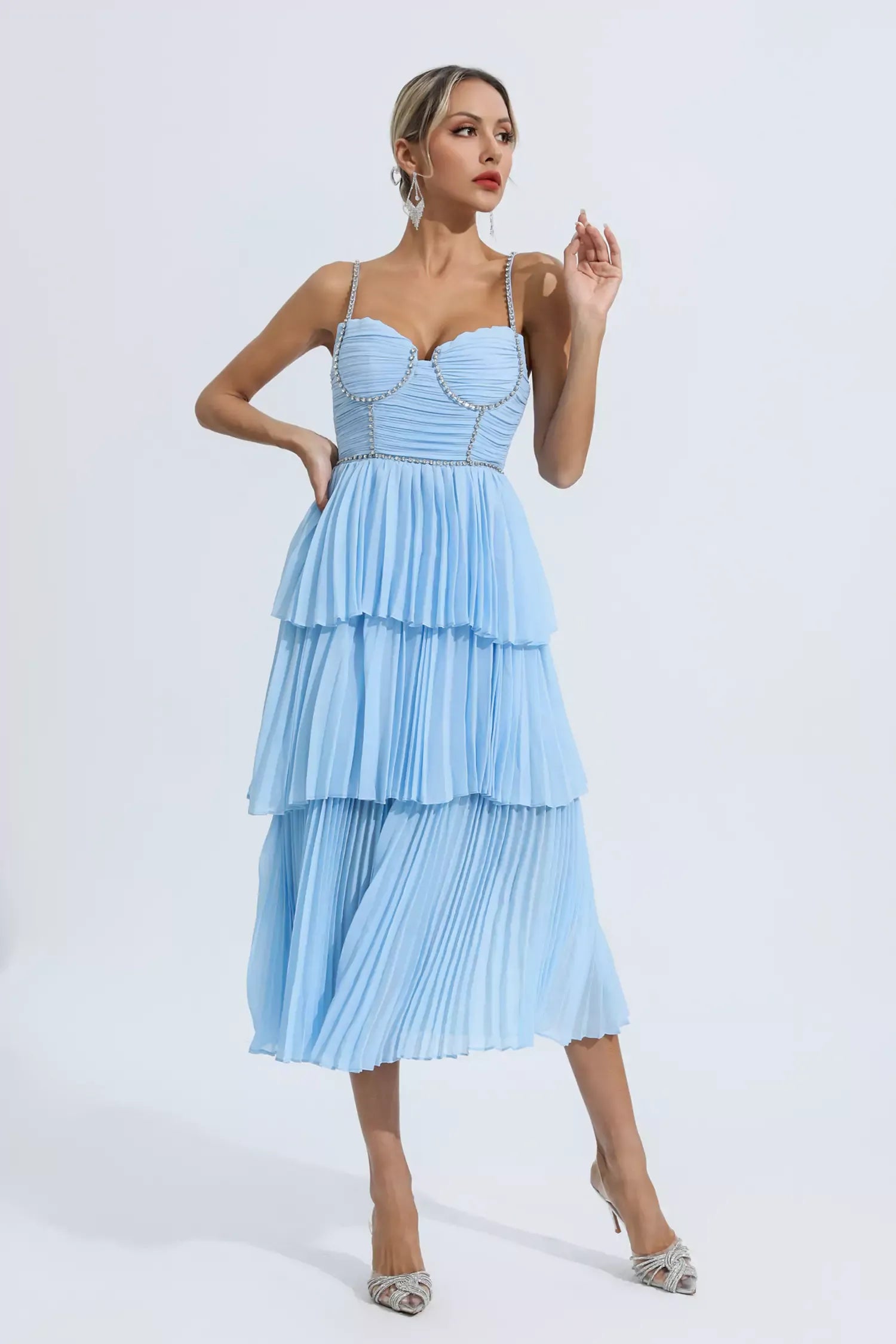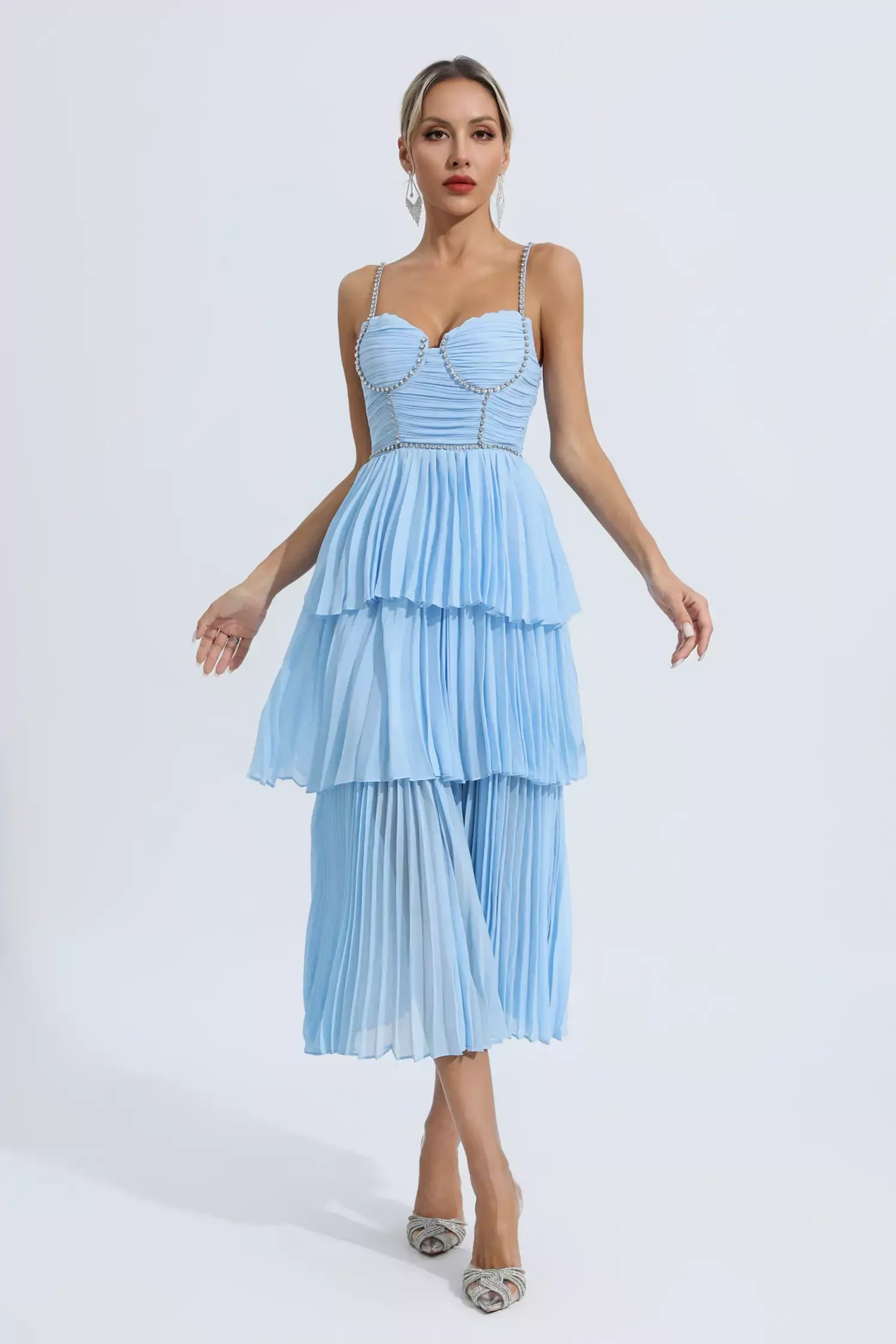 The Meredith Blue Diamond Ruched Midi Dress is sure to wow the crowd at your next special event! Cut from high-quality pleated fabric, diamond-embellished suspenders, meticulous tailoring, bringing charming details. The high-waisted design and loose skirt easily flatter your figure. Pair it with high heels for a party-ready look.
