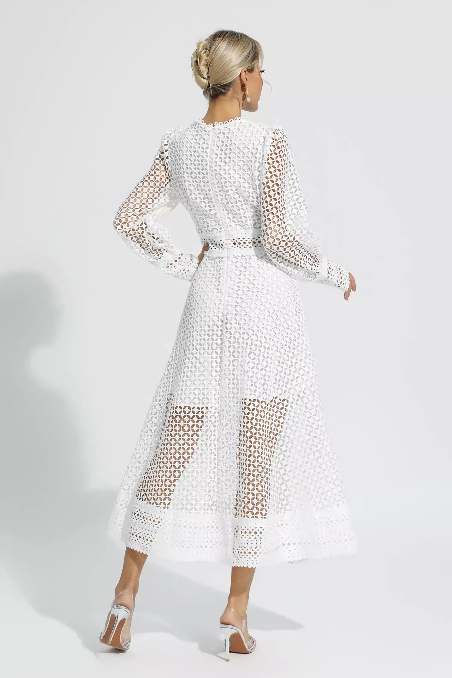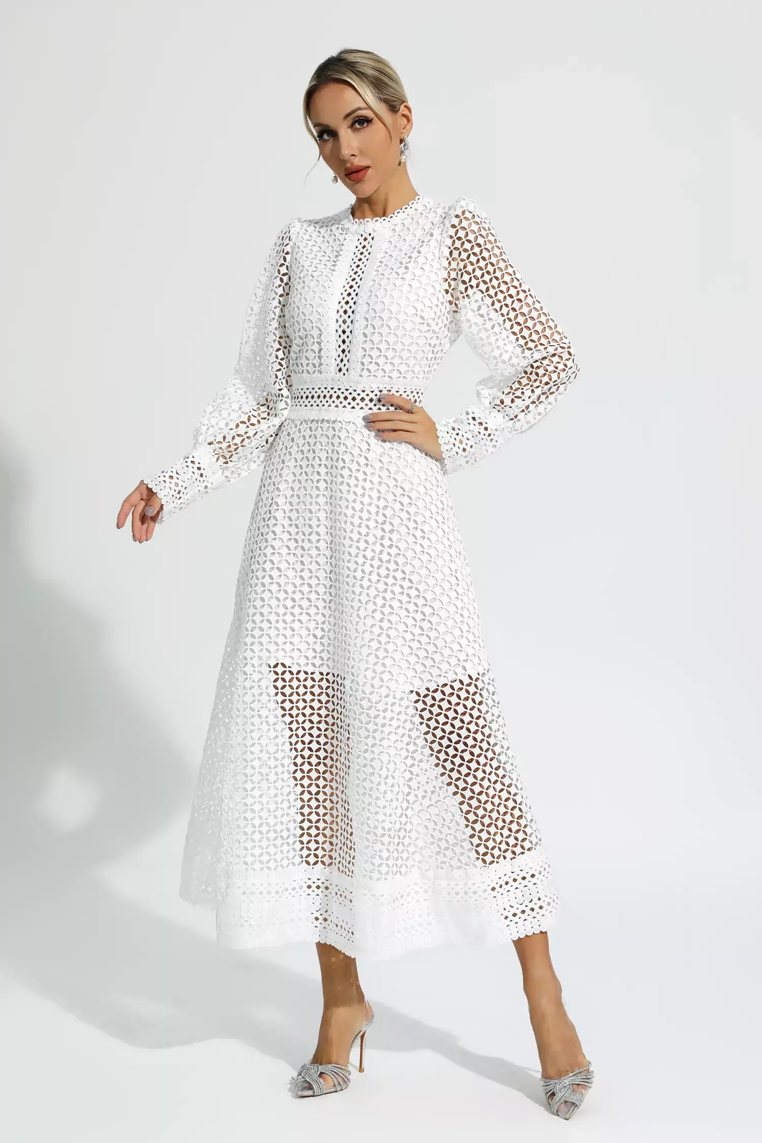 There is no doubt that you will receive many compliments when you wear the Monroe White Hollow Long Sleeve Maxi Dress. This elegant dress features long cut-out sleeves, a nipped-in waist, and an A-line skirt for a charming look. It's suitable for any occasion. Simply pair with heels or flat sandals to complete the look. Do not hesitate.