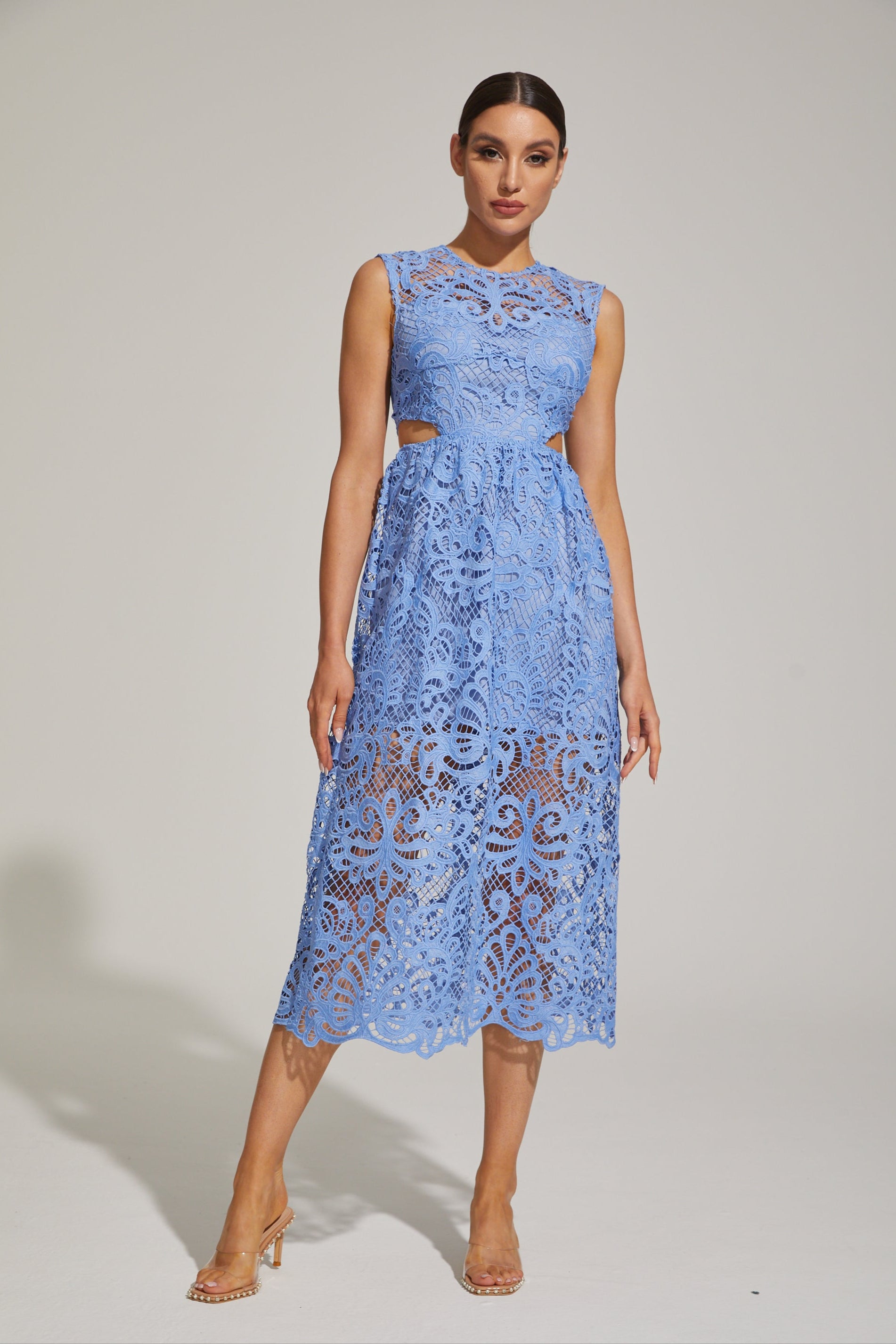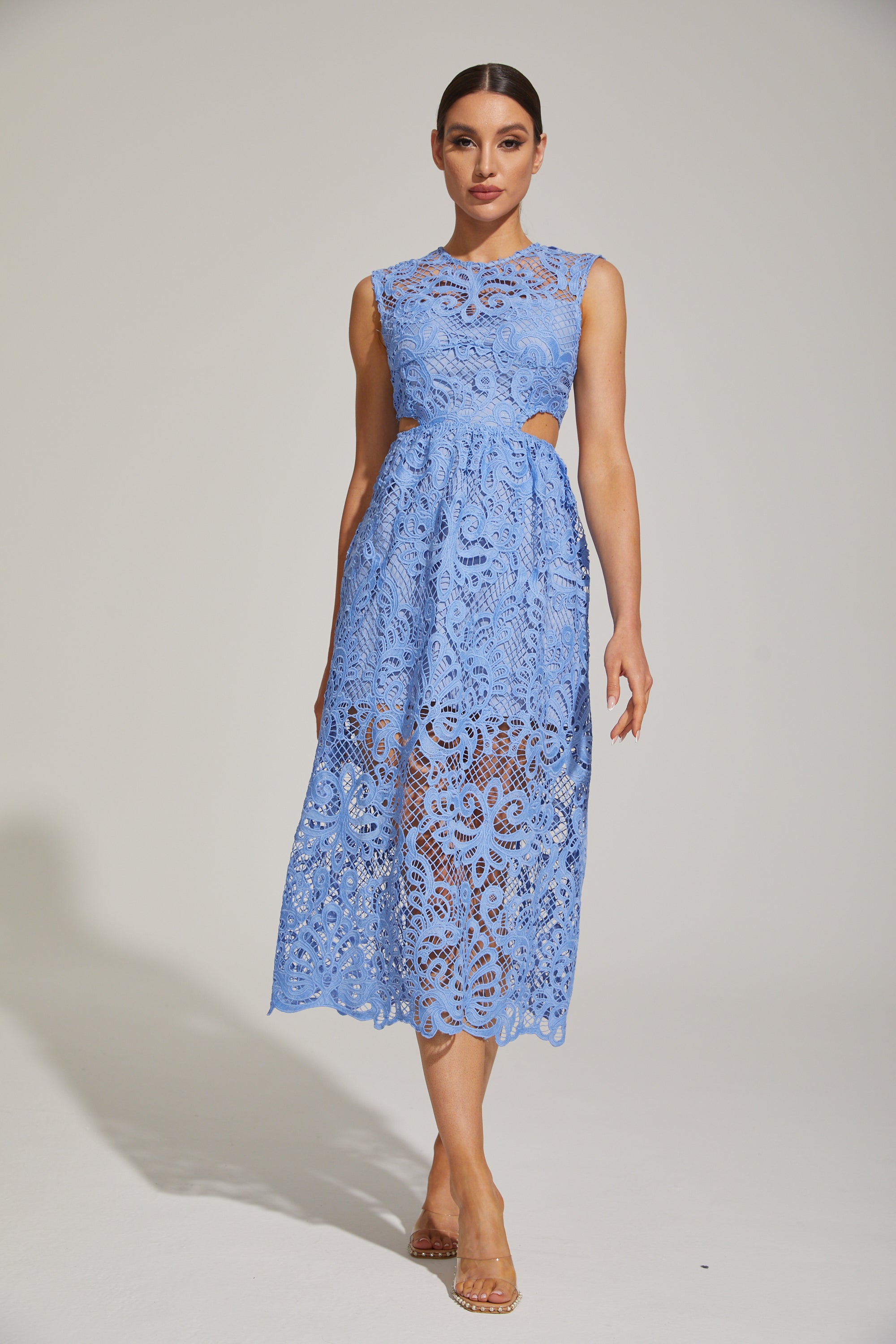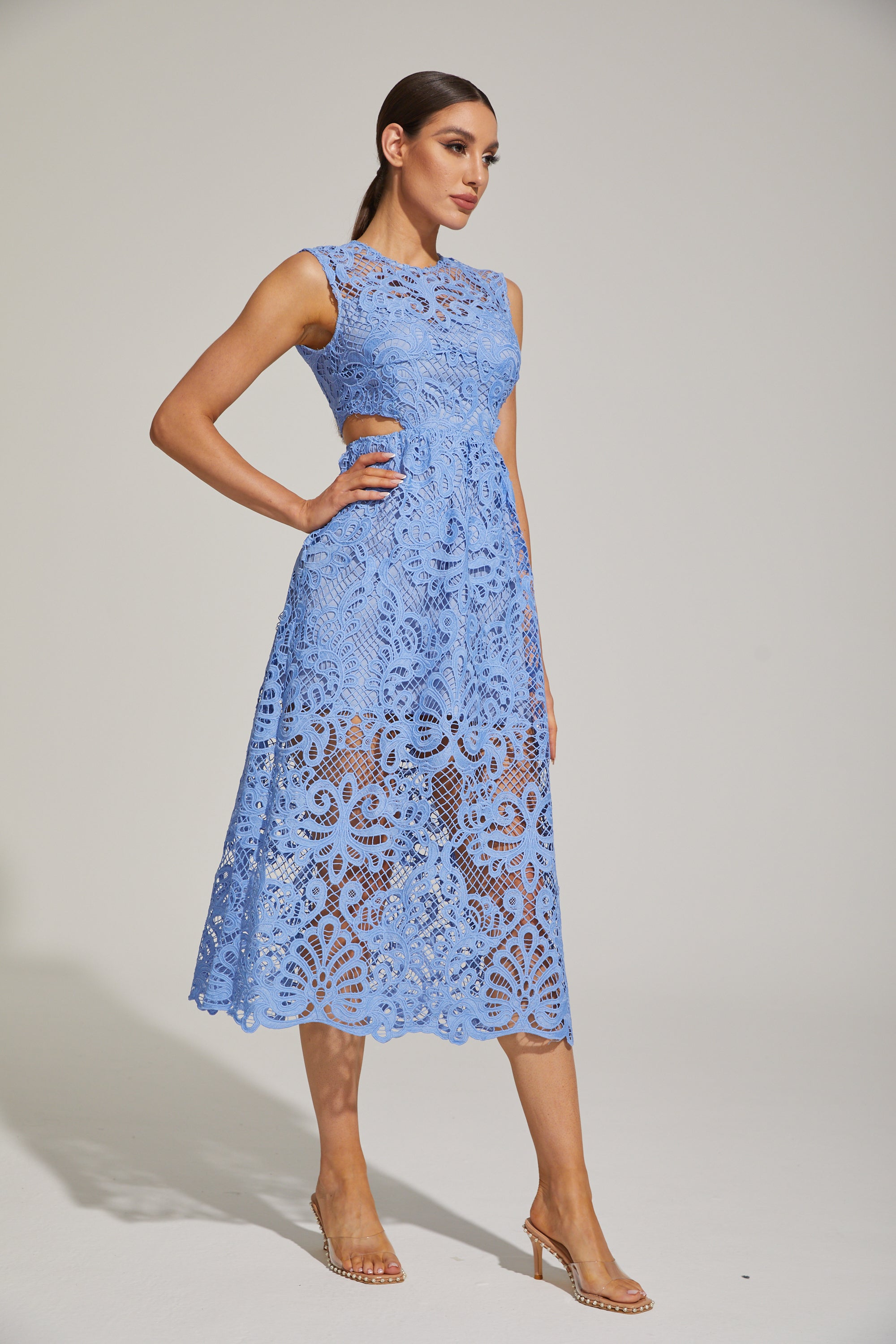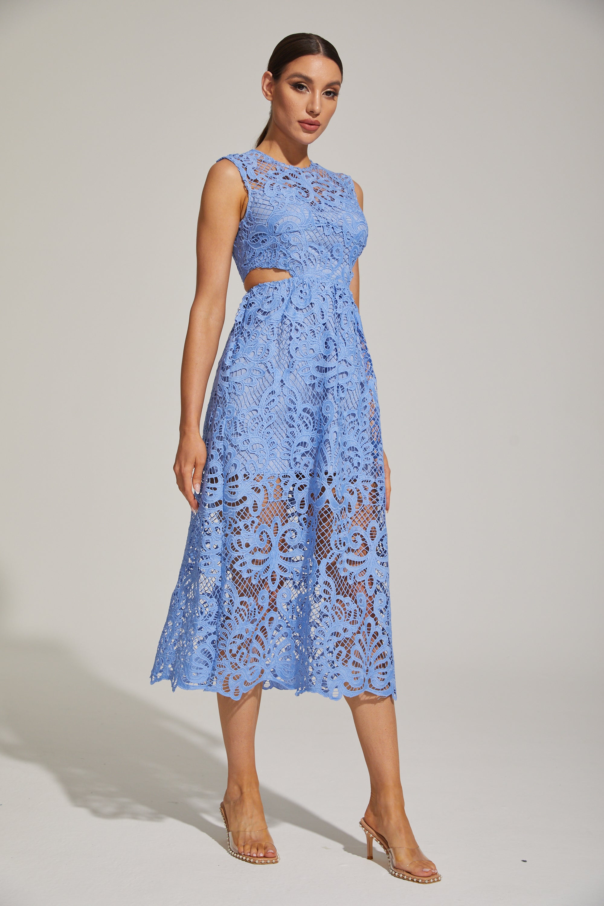 The Quitalia Blue Floral Cut - Out Lace Midi Dress is a chic statement piece. Its light blue floral lace exudes vintage charm, while waist cut - outs add modern edge. The midi length and scalloped hem create a graceful silhouette, making it ideal for semi - formal events like garden parties or cocktail gatherings.