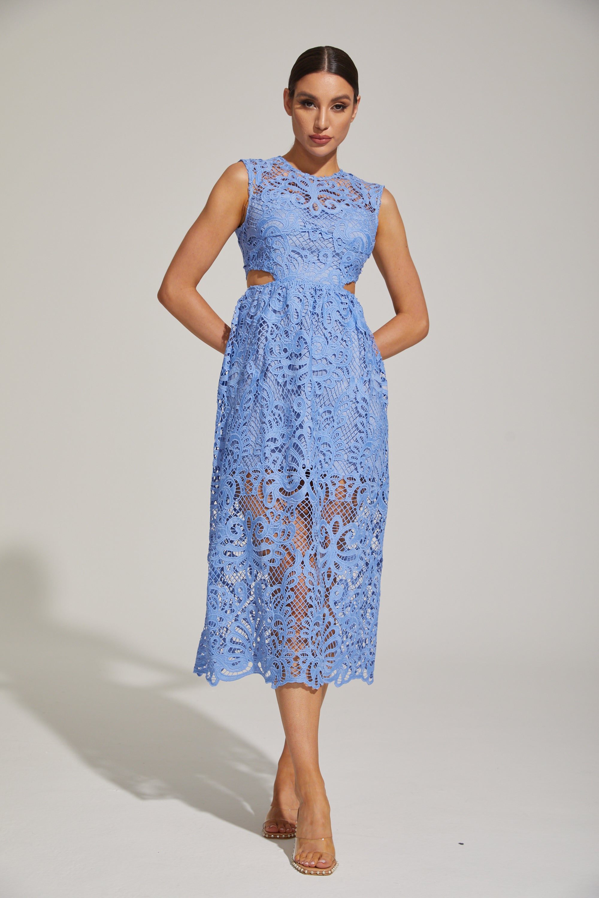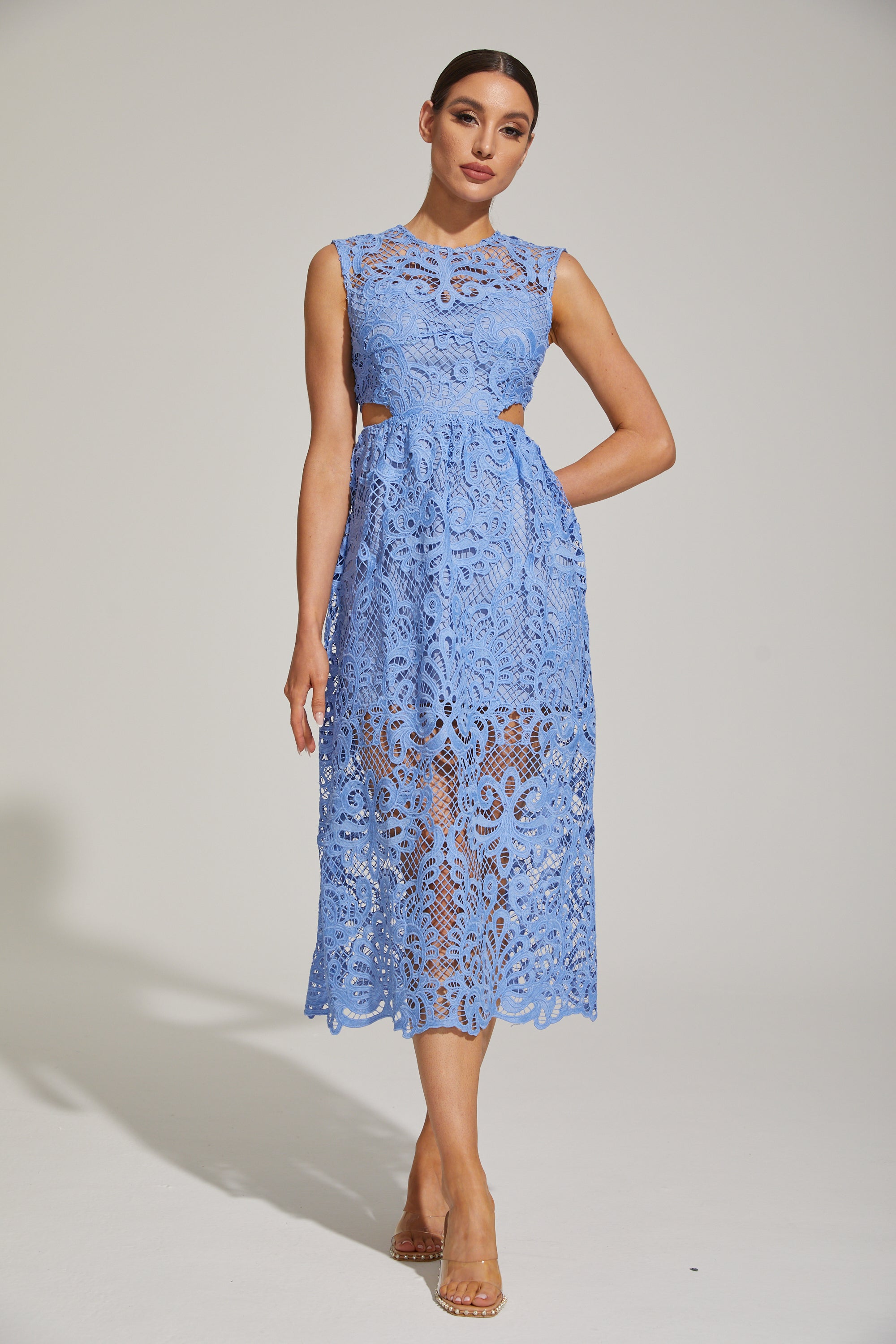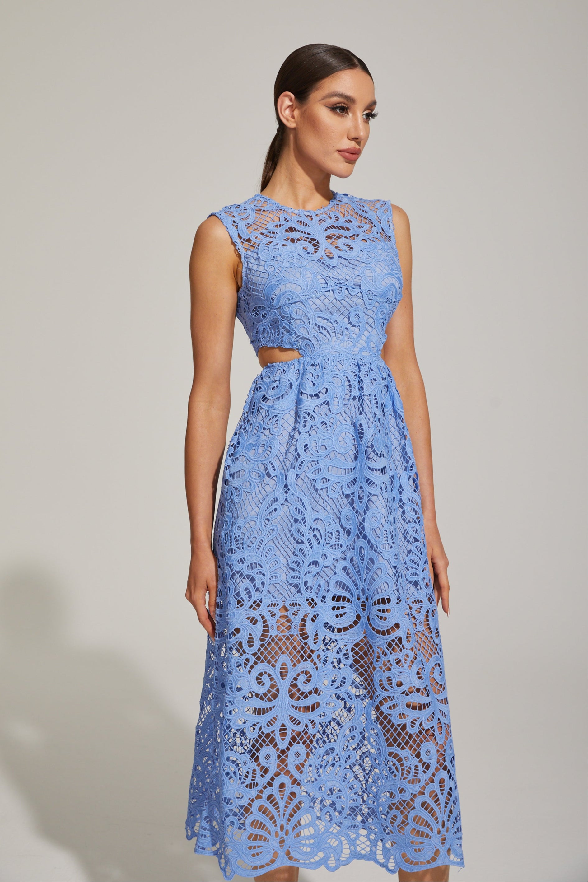 The Quitalia Blue Floral Cut - Out Lace Midi Dress is a chic statement piece. Its light blue floral lace exudes vintage charm, while waist cut - outs add modern edge. The midi length and scalloped hem create a graceful silhouette, making it ideal for semi - formal events like garden parties or cocktail gatherings.