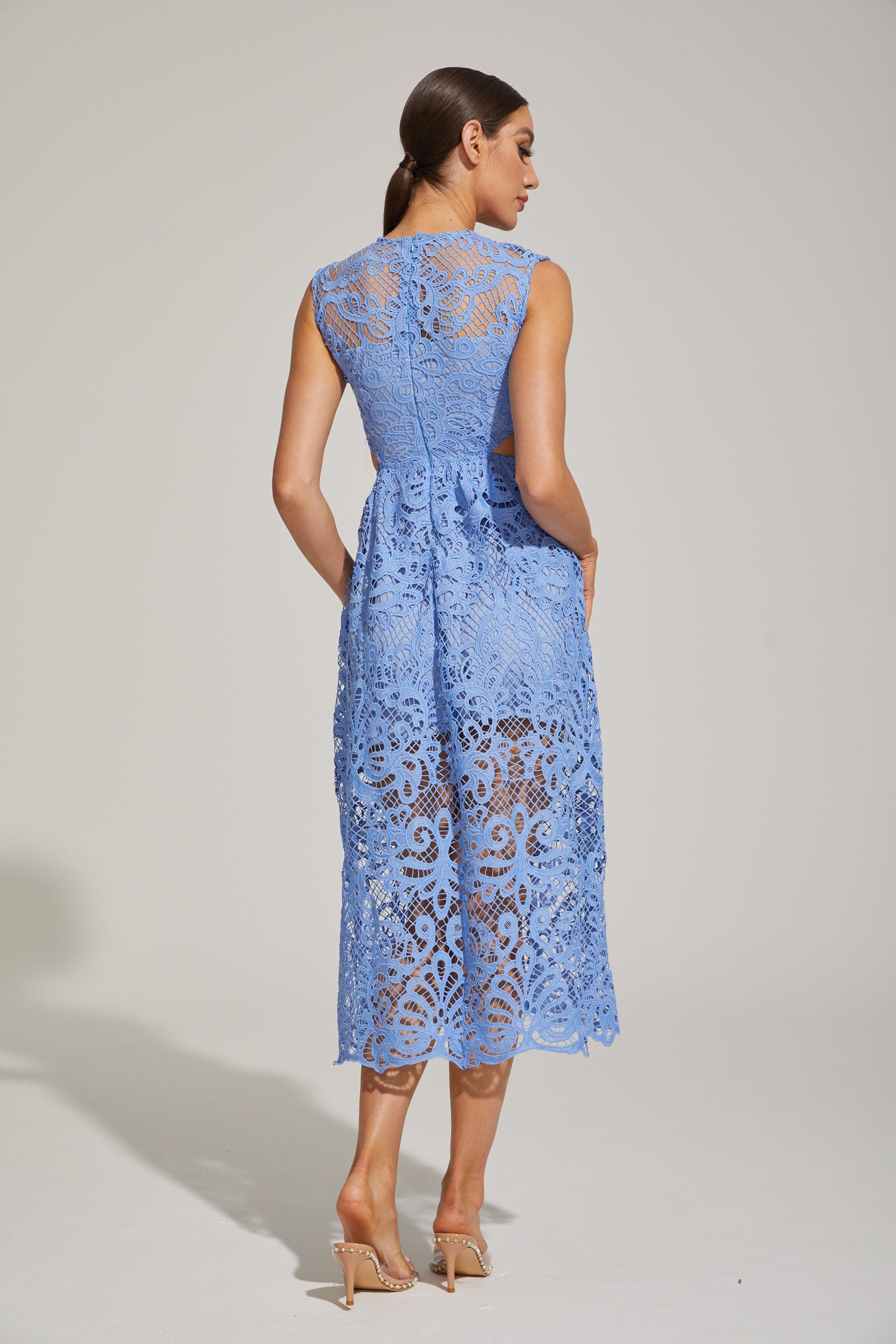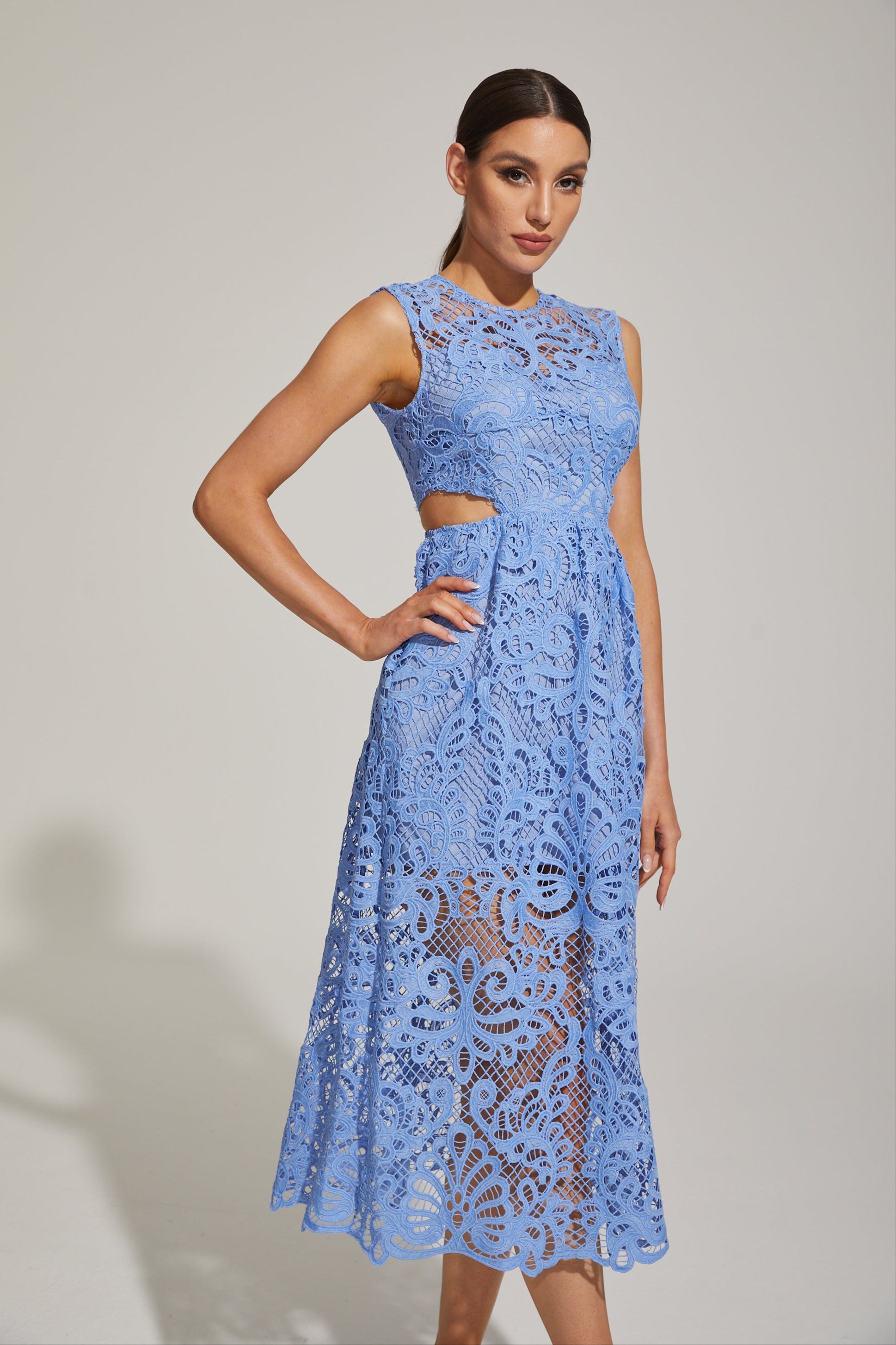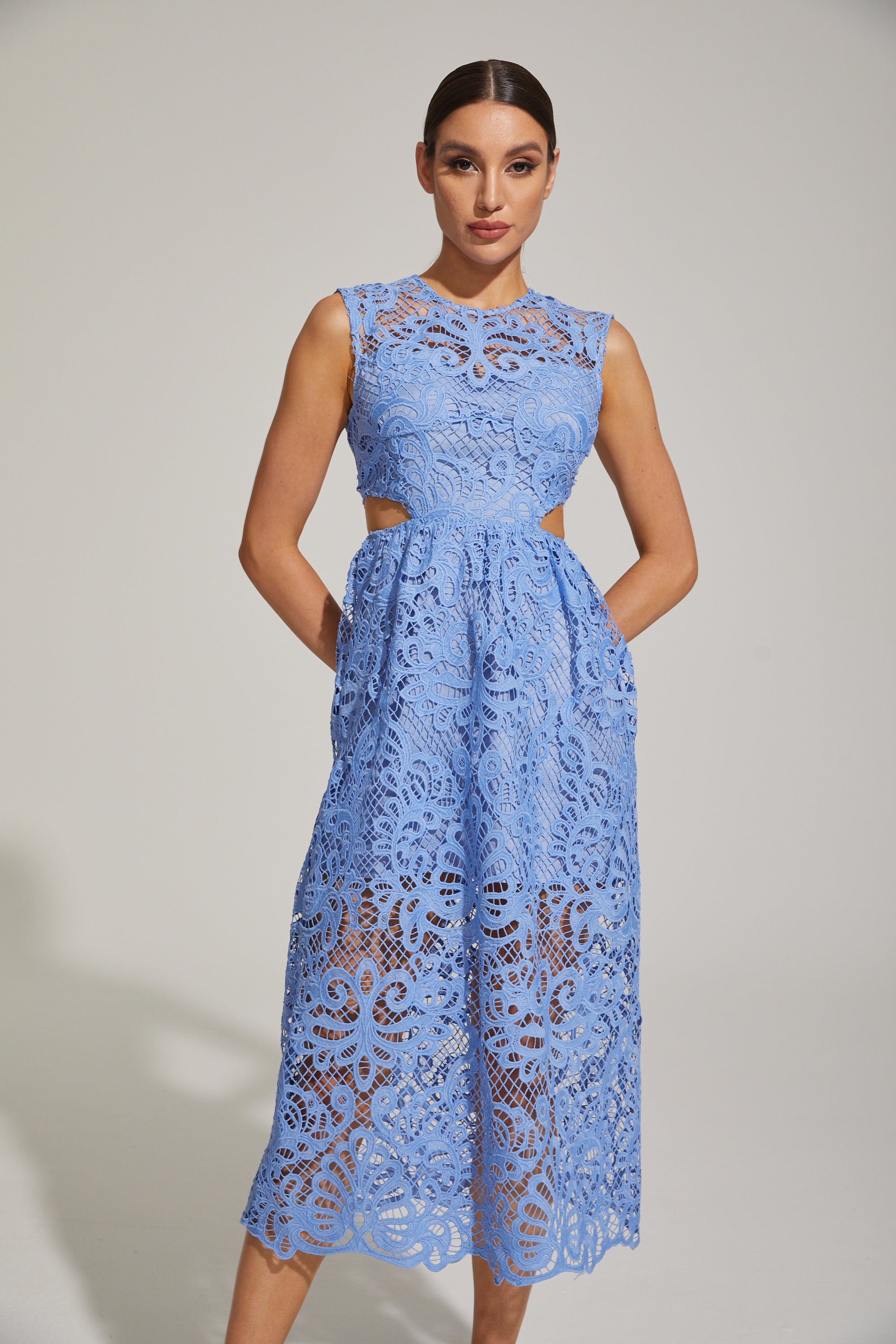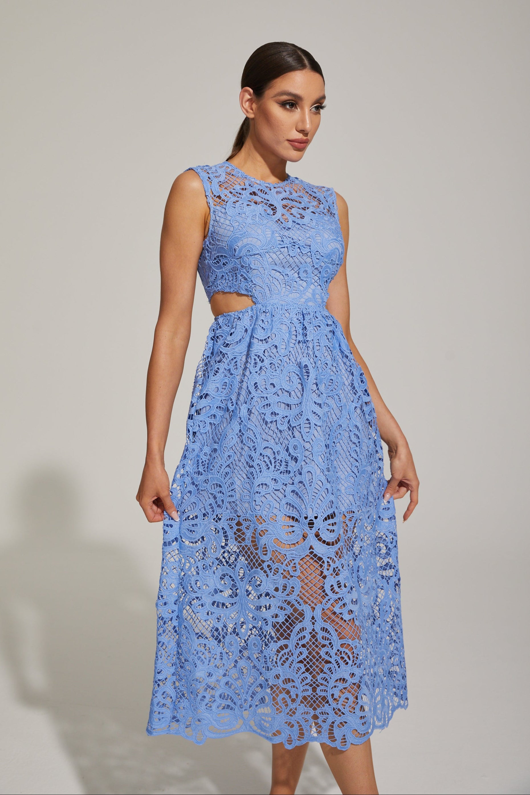 The Quitalia Blue Floral Cut - Out Lace Midi Dress is a chic statement piece. Its light blue floral lace exudes vintage charm, while waist cut - outs add modern edge. The midi length and scalloped hem create a graceful silhouette, making it ideal for semi - formal events like garden parties or cocktail gatherings.