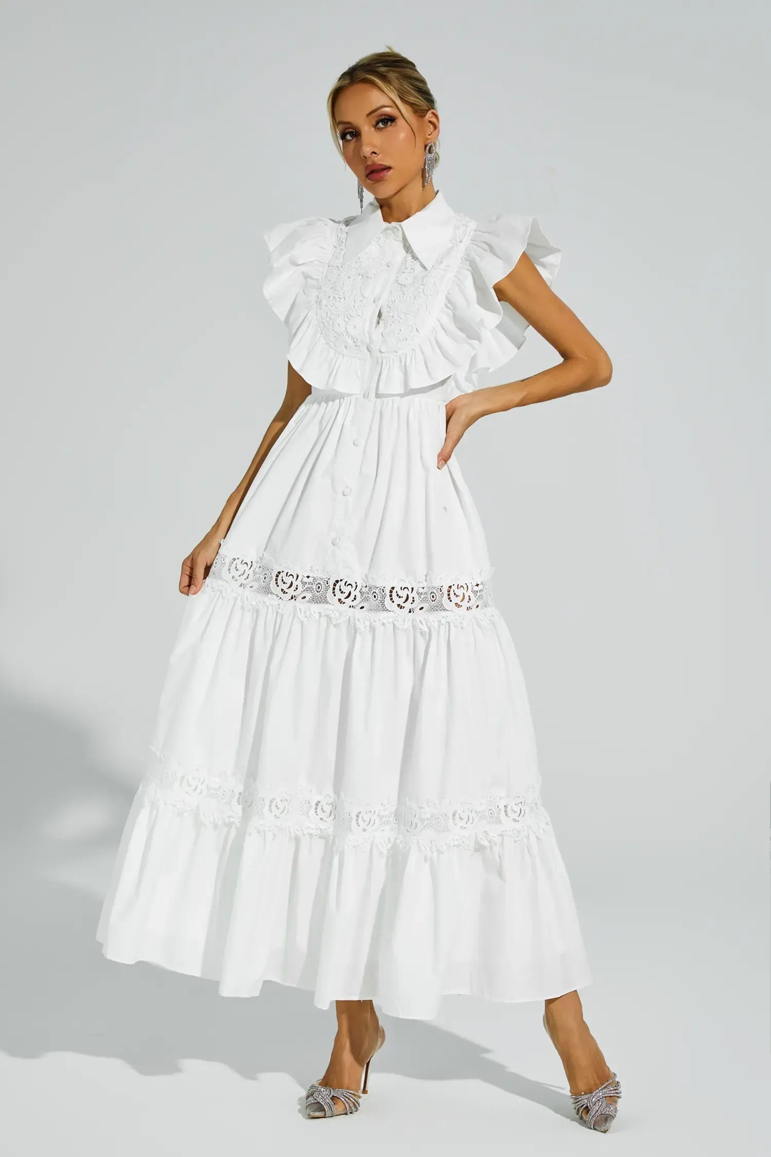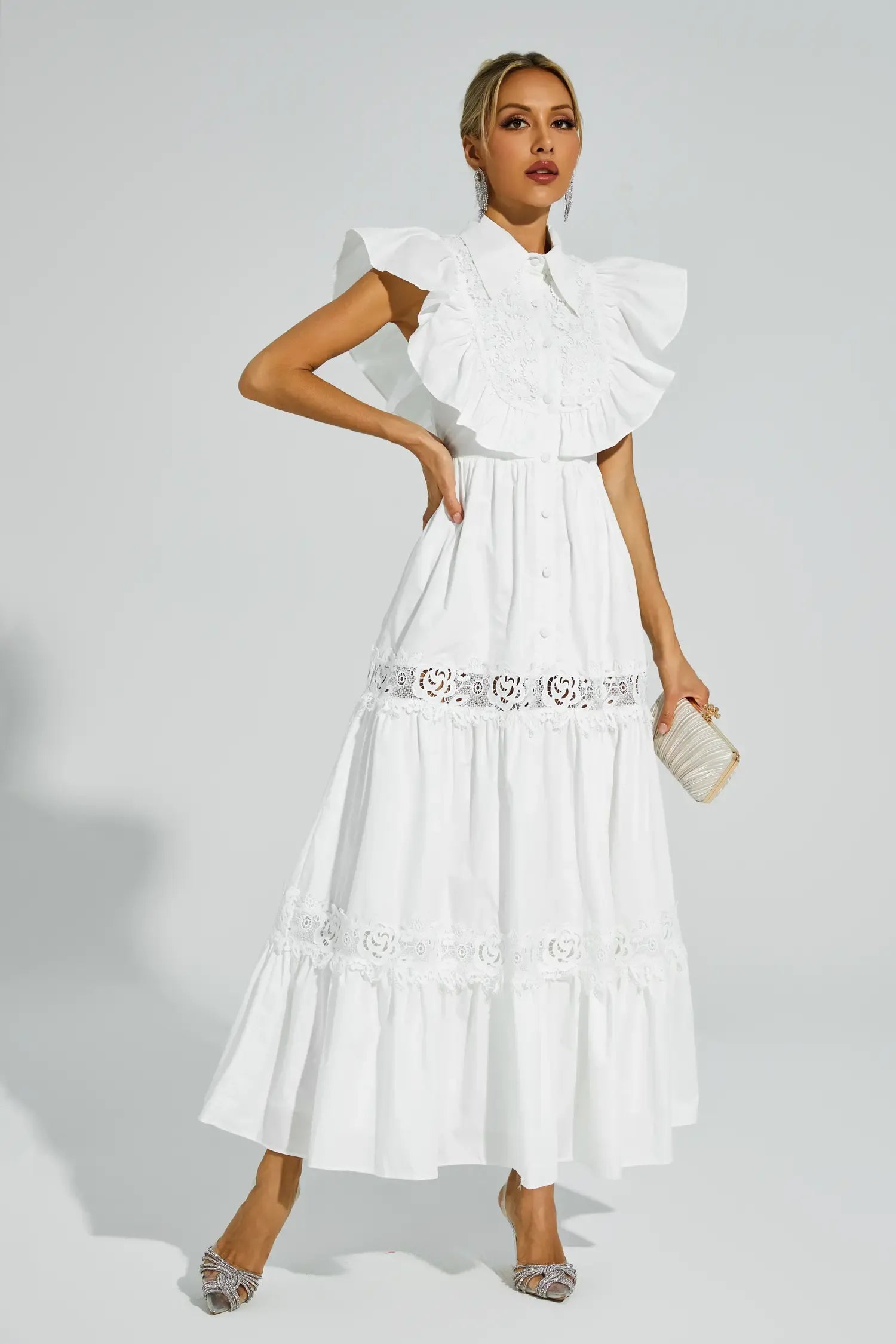 The Wesley White Sleeveless Ruffle Maxi Dress is a stunning piece that exudes femininity and elegance. Designed with a delicate sleeveless silhouette and adorned with exquisite ruffle details, this dress is perfect for any special occasion. The intricate embroidery adds a touch of sophistication, making it a must-have for fashion-forward women.